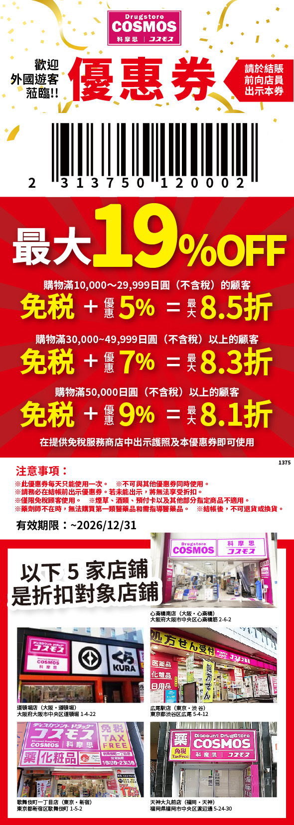 【心齋橋藥妝店】COSMOS心齋橋南店,折扣最大的COSMOS優惠券