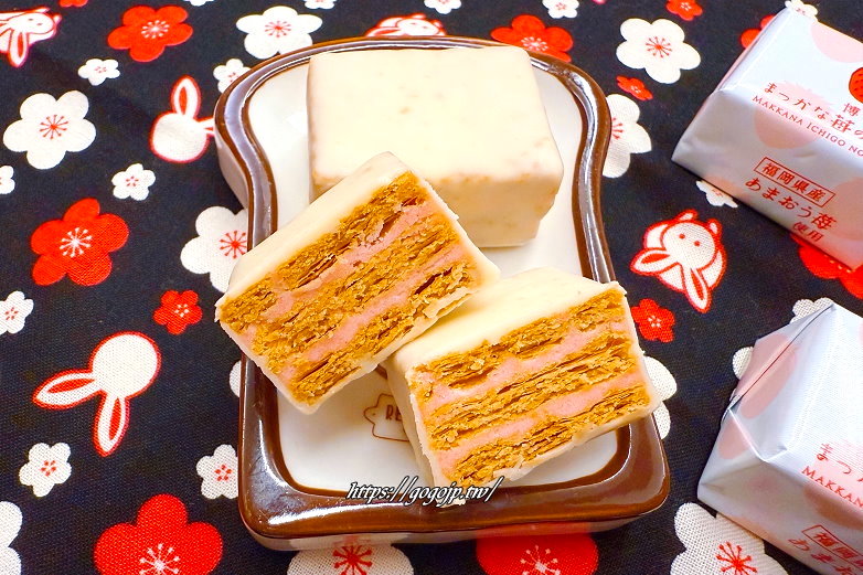 以薄脆餅乾夾著香甜微酸甘王草莓巧克力,一撕開就會聞到草莓香氣,福岡旅遊回憶都湧上心頭了~XD
