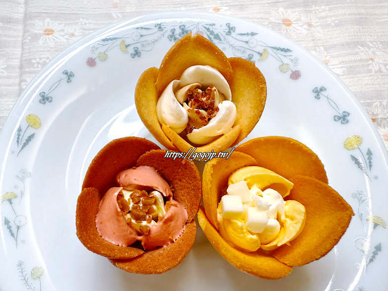 這次買了一盒9朵花,3種口味:奶油、起司和期間限定的蘋果奶油焦糖,前2個是經典口味~