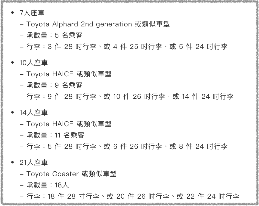 *注意:如乘客及行李數量超過承載量時,司機有權拒絕接送,且不予退款
