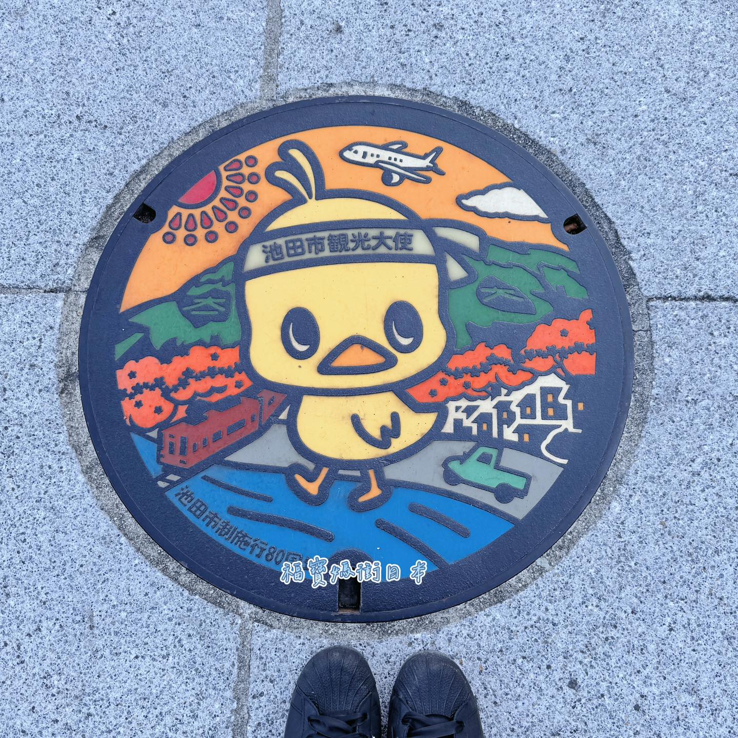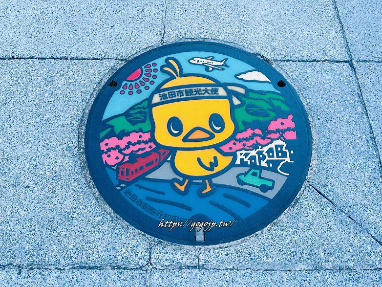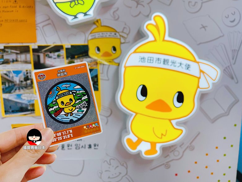 抵達後別急著進去,館外有一排4個小雞與春夏秋冬的人孔蓋,頭上還綁著池田觀光大使頭巾,超可愛的!